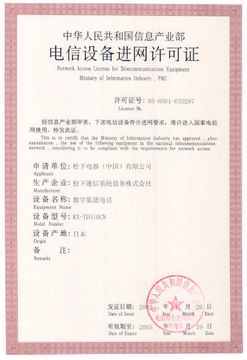 当前位置:首页 > 走进至泰 > 资质荣誉 > 松下数字集团电话KX-TD510CN电信设备进网许可证