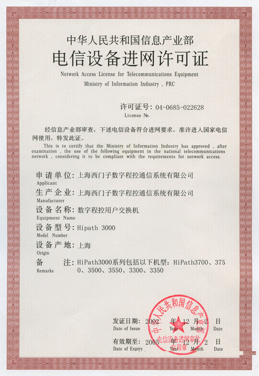 当前位置:首页 > 走进至泰 > 资质荣誉 > 西门子程控用户交换机Hipath 3000电信设备进网许可证