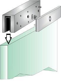 没有包框的玻璃门需要有配件来辅助安装。安装方法与普通门的表面安装方法基本雷同,只不过是在第三步安装继铁板的时候不同,安装方法如图九所示。 把U型槽连同橡胶缓冲垫及不锈钢垫片(放在锁螺丝的一边)套在玻璃门上,用无头内六角螺丝锁在玻璃门上,然后把继铁板固定在U型槽上。对于不同的玻璃门厚度及不同型号的电磁锁,我们提供不同型号的安装配件:UBG 支架 ,规格请见下表 :